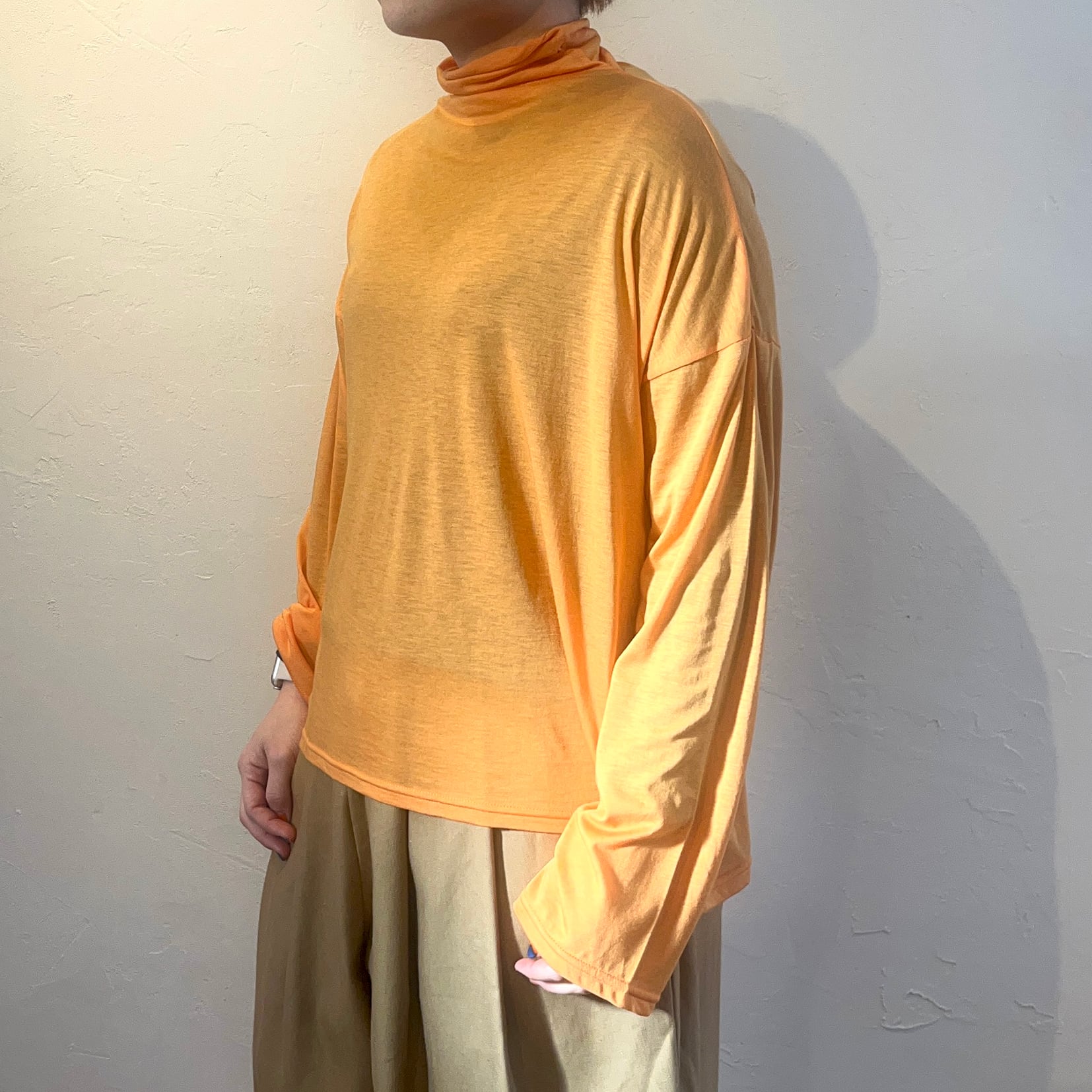 このカットソーは、ハイネックデザインで首元をおしゃれに演出し、