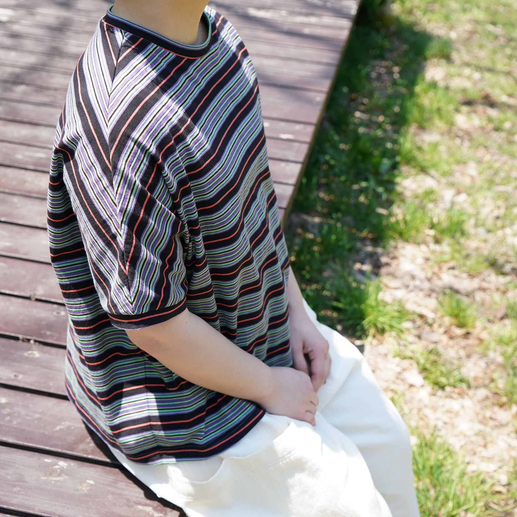 Tops:unseul マルチボーダーカラーカットソー  <BK×PU>