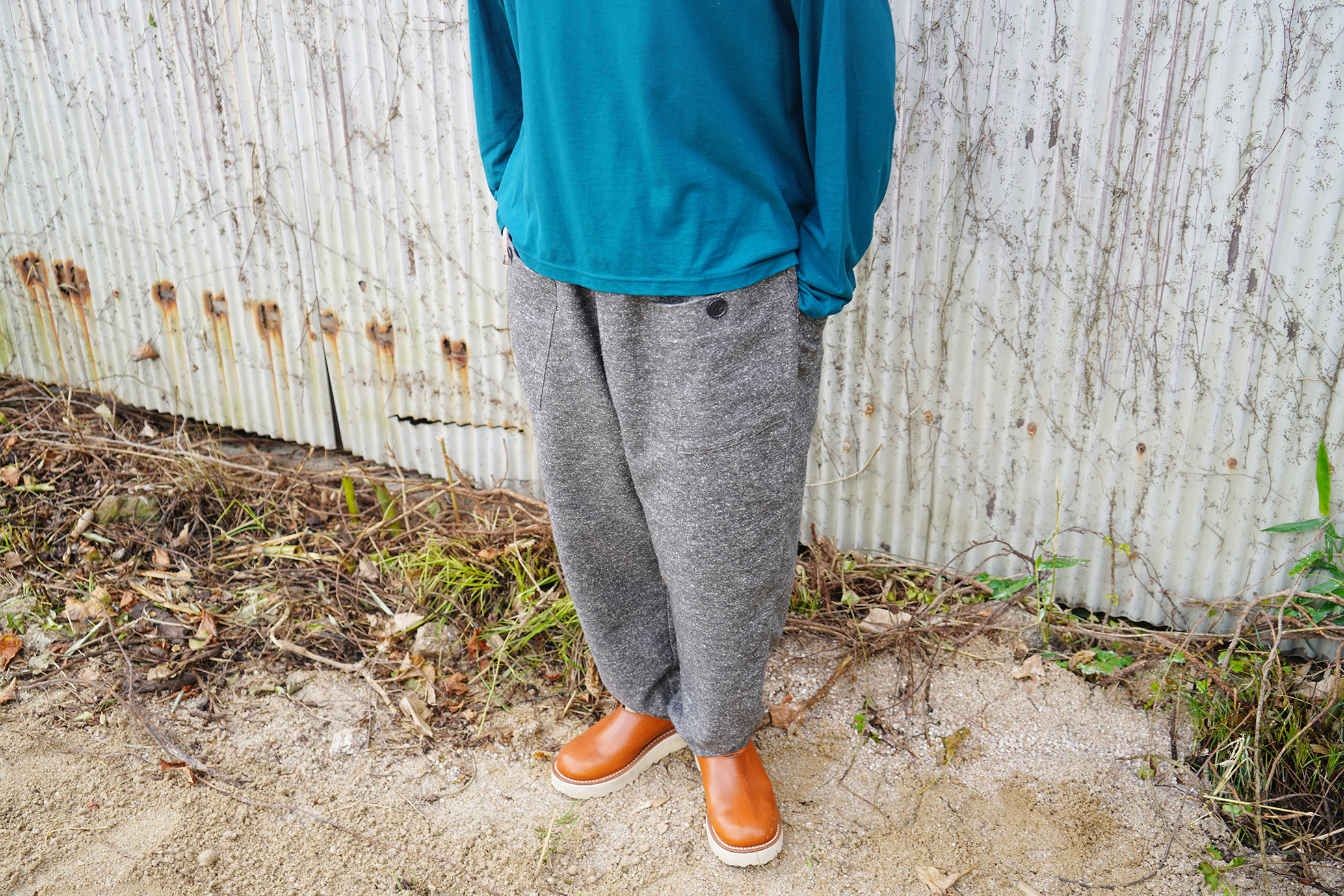 ヒップや太もも辺りはゆったりとしたシルエットで、裾に向かって細くなる、ワイドすぎないエッグパンツシルエットです。